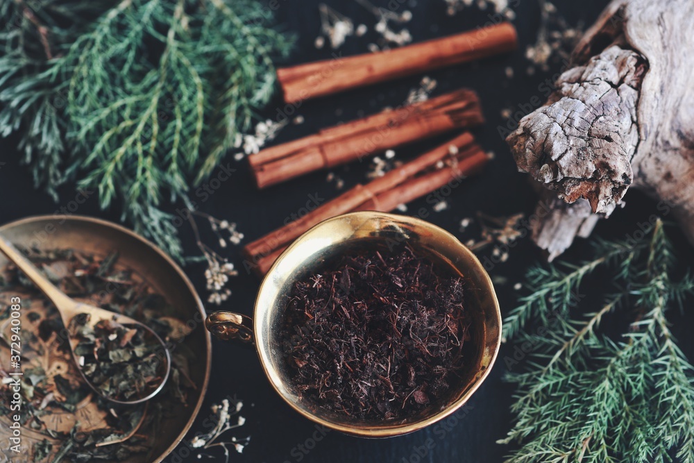 Golden Teacup Filled With Dirt On Wiccan Witch Altar Spell Casting Ingredients Cinnamon Sticks Black Earth Dried Herbs Evergreen Fir Branches Close Up Of Tea Cup With Blurry Dark Background Stock